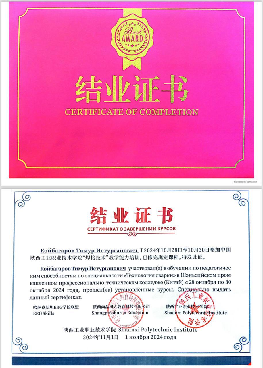 Қобда көпсалалы колледжінің арнайы пәндер оқытушысы Койбагаров Тимур Истурганович «ERG колледждер үшін» жобасы аясында өткен «Колледждер альянсының үздік педагогы» байқауының жеңімпазы атанып, Қытай Халық Республикасының Шаньси провинциясында «ERG көмек» корпоративтік қоры ұйымдастырған шетелдік тәжірибеден өтті.